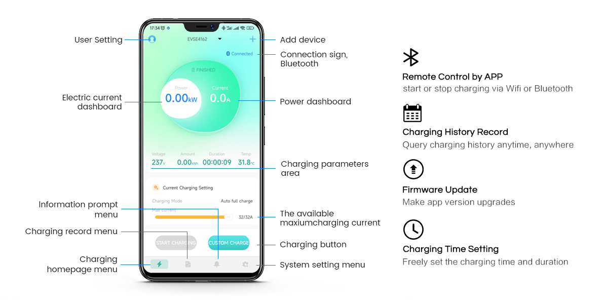 This is an APP wall-mount charger and suitable for home use. It is easy to install, stable in performance, and has a complete protection mechanism. The APP could show current, consumption and other detailed charging parameters. Also, those parameters could be set through the APP before charging. Automatic upgrade program could always keep latest version. The charger can be used with stand.